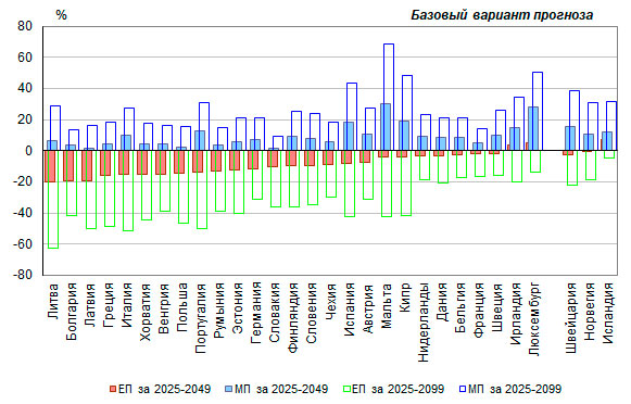 по базовому варианту прогноза за 2025-2049 и 2025-2099 годы, в %