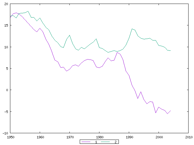 40 промышленно развитых стран мира. Коэффициент ежегодного прироста населения, 1950-2004