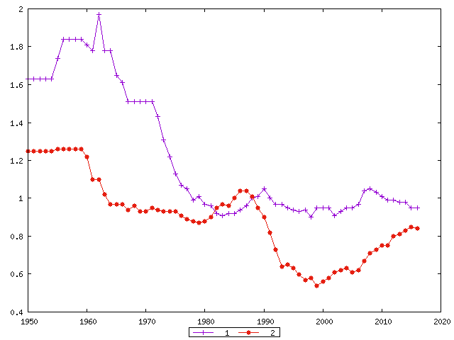 Промышленно развитые страны мира. Нетто-коэффициент воспроизводства, 1950-2016