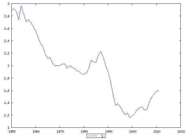 Промышленно развитые страны мира. Коэффициент суммарной рождаемости, 1950-2011