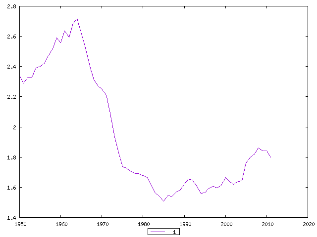 Промышленно развитые страны мира. Коэффициент суммарной рождаемости, 1950-2011