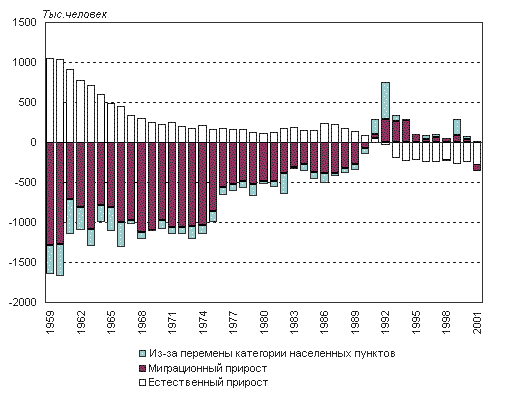 Рисунок 1. 6. Компоненты прироста (убыли) сельского населения России, 1959-2001 гг., тыс. человек Резкое сокращение преобразований поселков городского