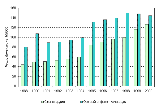 Рисунок 3.2. Число больных гипертонической болезнью (ГБ) и ишемической болезнью сердца (ИБС) с впервые установленным диагнозом на 1000 взрослого населения Количество острых инфарктов миокарда за этот период возросло на 24%, и только заболеваемость стенокардией с 1999 г. снижается (рис. 3.3).