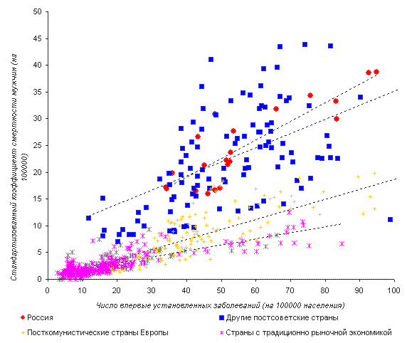 В России за 11 лет - с 1990 по 2001 год - число больных с впервые в жизни установленным диагнозом активного туберкулеза увеличилось в 2,58 раза, а число умерших от туберкулеза - в 2,47 раза27. Рост почти синхронный. Более того, рост смертности начался даже раньше роста числа заболевших. Показатели смертности начали расти в 1989 году, заболеваемости - в 1991. Рост смертности ускорился после 1990 года, заболеваемости - после 1992. Контингенты больных вообще сокращались до 1993 года. Все это говорит о неполноте медицинской статистики и заставляет подозревать, что многие больные поступают под наблюдение на той стадии заболевания, когда медицина бессильна. Можно попытаться сравнить соотношение численности заболевших и умерших от туберкулеза в России и других странах. Такое сравнение представлено на рис. 3.7 по данным о заболеваемости и смертности от туберкулеза в разных странах за разные годы после 1979 г. Чем ниже точка на графике, тем эффективнее борьба с болезнью. В верхней части графика (неэффективное лечение) - располагаются точки, относящиеся к России и другим постсоветским странам, затем идут бывшие "социалистические" страны Европы, а в самом низу - страны с традиционно рыночной экономикой. Соответствующим образом располагаются и прямые линии, полученные методом линейной регрессии и представляющие средние значения показателя смертности, соответствующего уровню заболеваемости в данной группе стран. Как видно из графика, даже в тех случаях, когда в западноевропейских странах фиксировались уровни заболеваемости туберкулезом, сходные с российскими столь высоких уровней смертности и столь высокого отношения смертность - заболеваемость там не было.