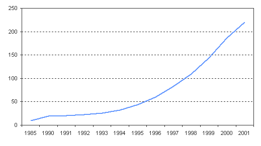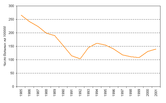 Рисунок 3.10. Число больных с впервые установленным диагнозом алкоголизм и алкогольный психоз на 100000 взрослого населения В отличие от алкоголизма, наркомания в массовых масштабах-относительно новое для России явление. Но, недавно возникнув, она быстро выросла в серьезную угрозу. С 1985 по 2001 г. число больных с синдромом зависимости от наркотических веществ, находящиеся под диспансерным наблюдением, выросло более чем в 22 раза. Как считают наркологи, это не все наркоманы, а малая их часть.
