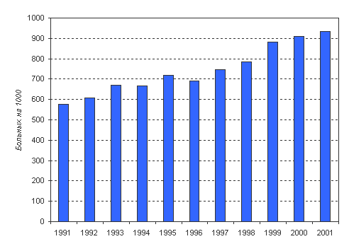 3.2. За 10 лет заболеваемость подростков выросла более чем на 60% В 2001 г. зарегистрировано 6835 тыс. случаев первичных обращений подростков 15-17 лет за медицинской помощью. Медицинская статистика свидетельствует о постоянном увеличении заболеваемости подростков. Таблица 3.6. Заболеваемость подростков 15-17 лет с диагнозом, установленным впервые в жизни на 1000 населения соответствующего возраста