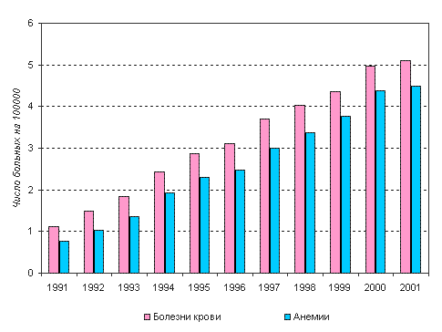 Рисунок 3.13. Болезни крови и кроветворных органов, в том числе анемии на 100000 подростков За последние годы XX столетия наблюдался очень большой рост целой группы неинфекционных соматических заболеваний. В частности, резко выросло число онкологических заболеваний среди подростков-с 1991 по 2001 гг. оно увеличилось в 3,6 раза. Болезни эндокринной системы, расстройства питания, нарушения обмена веществ и иммунитета за этот период дали еще больший рост заболеваемости - в 4,44 раза. Число заболеваний крови и кроветворных органов увеличилось в 4,6 раза, в том числе анемий в 5,85 раза. В 2,65 раза стало больше обращений по поводу заболеваний сердечно-сосудистой системы. Болезни, характеризующиеся повышенным кровяным давлением, стали регистрироваться в 2,2 раза чаще. Осложнения беременности, родов и послеродового периода у женщин 15-17 лет увеличились с 322 до 1141 случаев на 100000 представительниц этой возрастной группы, т.е. выросли в 3,54 раза. В 1,69 раза стало больше заболеваний органов пищеварения,