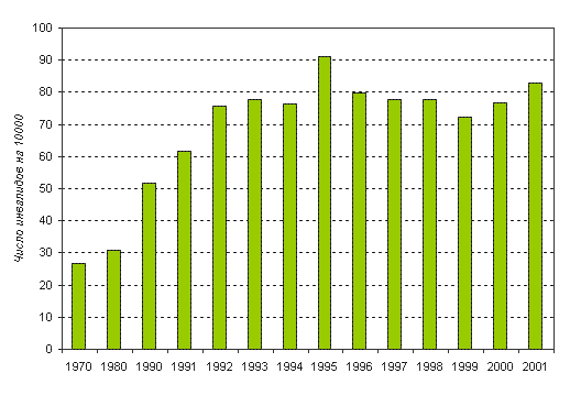 3.5.2. Число инвалидов снова растет Число лиц, официально признанных инвалидами, в России долгое время нарастало. Между 1970 и 1995 годами уровень инвалидности взрослого населения страны увеличился с 26,6 до 91,1 на 10000 взрослых жителей страны-рост в 3,4 раза за 25 лет. После 1995 г. началось некоторое снижение числа инвалидов, выявляемых впервые. В 1999 г. впервые были признаны инвалидами 1049,7 тыс. человек (72,1 на 10000), но затем показатели инвалидности снова стали увеличиваться (рис. 3.21).