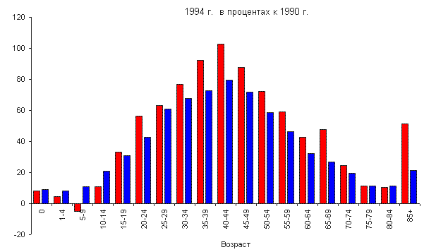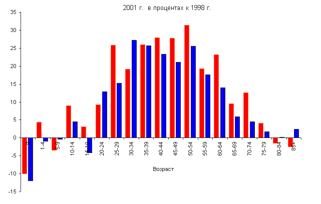 На рис. 4.4 представлено изменение возрастных интенсивностей смертности мужчин и женщин за период после 1998 г. Более всего увеличились показатели смертности в рабочих возрастах, рост смертности внутри этого интервала почти не зависит от возраста. Среднее увеличение для возрастов 15-59 лет показателя смертности мужчин составило 21% (максимум - 31% в возрасте 50-54 года), а женщин - 18% (максимум - 27% в возрасте 30-34 года). Сходство возрастных тенденций смертности мужчин и женщин выглядит достаточно неожиданно. Как видно из рисунка, характер роста возрастной смертности в последние годы существенно отличен от модели ее изменения в два предшествующие периода роста смертности. В 1965-1980 гг. рост смертности меньше затронул женщин рабочих возрастов, в то же время заметно выросла смертность пожилых. В 1990-1994 гг. смертность в рабочих возрастах увеличилась и у мужчин, и у женщин, при этом рост был более чем в 2 раза существеннее - у мужчин, в среднем, на 45%, а женщин - на 37%. Кривая роста имела четко выраженный максимум в возрасте 40-44 года и рост затронул самые старшие возрастные группы.