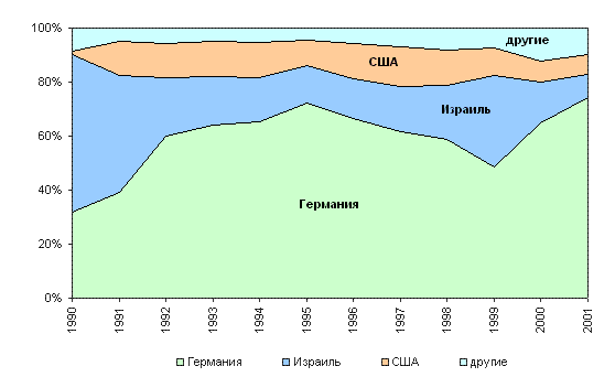 Направления эмиграции остются традиционными: большая часть эмигрантов выезжает в Германию, за ней следуют Израиль и США, Эмиграция в Германию достигла пика в 1995 г., когда она составила 79,6 тыс. человек, после этого она уменьшилась примерно до 50 тыс., а в 2001 г. до 43,7 тыс. человек. Эмиграция в Израиль значительно уступает немецкой. Поскольку прием репатриантов Израилем не ограничивается, эмиграция в эту страну наиболее остро прореагировала на финансовый кризис, более чем удвоившись в 1999 г. относительно предыдущих лет. Скорее всего, это была в большей мере заявочная, чем фактическая эмиграция. Это предположение можно аргументировать значительно большей, чем обычно, разницей между количеством лиц, оформивших разрешение на выезд, и снявшихся с регистрации по месту жительства в 1999 г. (табл. 5.10). В 2000 г. выезд в Израиль принял обычные размеры - 16,3 тыс. человек, а в 2001 г. был совсем небольшим (4,8 тыс. человек), вероятно, из-за резкого обострения обстановки в этой стране. Подобное воздействие на эмиграцию из России оказали и трагические события 11 сентября 2001 г. в США: выезд туда упал в 2 раза (4,5 тыс. человек в 2001 г. против 9,5 в 2000). На упомянутые три страны в 2000 и 2001 гг. пришлось более 90% российской эмиграции. Доля других стран постепенно повышается, среди них все значимее становятся потоки в Канаду и Финляндию (рис. 5.4).