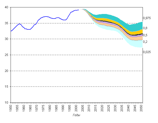 Рисунок 6.12. Фактическое (1950-2050 гг.) число женщин репродуктивных возрастов (15-49 лет) и прогноз на 2001-2050 гг. при разных доверительных вероятностях, млн. человек. Инерционные сценарии.