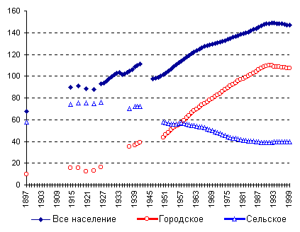 Рис. 1.1. Динамика населения России в 1897-1998 гг., тыс. чел. Источники: