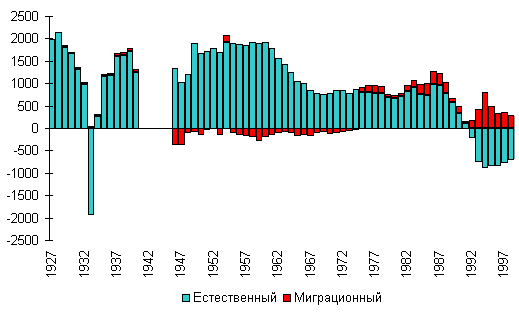 Рис. 1.2. Компоненты прироста населения России в 1927-1998 гг., тыс. человек Источники: