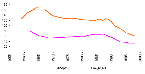 Рис. 3.10. Число абортов и число рождений на 1000 женщин в возрасте 15-49 лет. Россия, 1959-1998