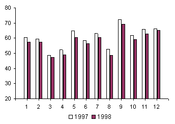 Снижение числа абортлв наблюдалось во всех экономических районах России (рис. 3.9). Из 88 субъектов Федерации, по которым имеется статистика Минздрава, коэффициент абортов (на 1000 женщин репродуктивного возраста) снизился в 1998 г., по сравнению с 1997 г., в 70. Еще в 4 он мало изменился, а в 14 - увеличился, в том числе в Орловской области, в трех республиках Северного Кавказа, в Удмуртии, Бурятии, Тыве, Читинской обл., Хабаровском крае, Магаданской области и еще в четырех автономных округах. Между 1996 и 1997 гг., при общероссийском снижении, коэффициент абортов вырос в 7 субъектах Федерации, причем не в тех, в которых произошел рост между 1997 и 1998 гг. Возможно, помимо собственно увеличения числа абортов, на региональном уровне большую роль играет структурный фактор. Некоторое увеличение рассматриваемого показателя в ряде территорий России в последние годы не идет ни в какое сравнение с резким и повсеместным его падением по сравнению с началом 90-х годов (практически во всех субъектах Федерации коэффициент абортов уменьшился за 1990-1998 гг. в 1,5 - 2 раза, а в отдельных - еще больше). Среднегодовой темп снижения числа абортов в 1990-е годы составил