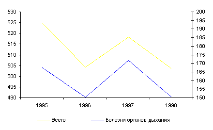 Рис. 4.1. Динамика первичной заболеваемости взрослого населения всеми болезнями и болезнями органов дыхания на 1000 населения. Россия, 1995-1998 На фоне снижения суммарной заболеваемости наблюдается абсолютный рост заболеваемости большинством основных нозологических групп и увеличивается их удельный вес среди всех болезней (табл.4.1.). Исключение составляют болезни органов дыхания. К числу тяжелых форм заболеваний органов пищеварения относится язва желудка и 12-перстной кишки. В 1995 г. заболеваемость язвой желудка составляла 146 на 100 тыс., а в 1998 г. она достигла 162 случаев. Неуклонно растет заболеваемость анемией. За последние 4 года она выросла на 27,4%. Таблица 4.1. Заболеваемость взрослых с диагнозом, установленным впервые, на 1000 населения и удельный вес отдельных заболеваний во всей заболеваемости. Россия, 1995-1998
