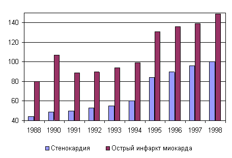 Первичная обращаемость по поводу болезней системы кровообращения с 1988 по 1998 г. выросла с 1044 до 1819 случаев на 100 тыс. населения. При этом стало больше таких тяжелых осложнений, как гипертоническая болезнь, стенокардия, ишемическая болезнь сердца. Количество острых инфарктов миокарда за этот период возросло на 86,2%. В 1998 г. острый инфаркт миокарда был зарегистрирован у 164,9 тыс. человек.