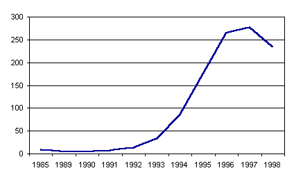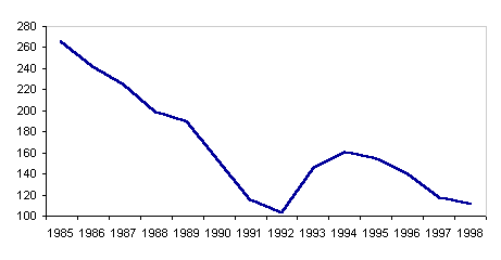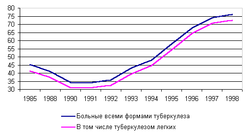 Рис. 4.3. Число больных с впервые в жизни установленным диагнозом активного туберкулеза на 100 тыс. населения по всем ведомствам. Россия, 1985-1998 После длительного постепенного снижения заболеваемости туберкулезом в 90-е годы в России отмечено резкое ухудшение эпидемиологической ситуации. За период с 1991 г. по 1998 гг. заболеваемость всеми формами активного туберкулеза выросла в 2,2 раза и составила в 1998 г. 76 на 100 тыс. населения. Заболеваемость туберкулезом легких за этот период увеличилась в 2,35 раза. Следует подчеркнуть, что в медицинской статистике встречается два ряда цифр заболеваемости активным туберкулезом. Первая группа показателей (более низкие коэффициенты заболеваемости) характеризуют ситуацию с заболеваемостью, регистрируемой в лечебных учреждениях Министерства здравоохранения России. Вторая группа показателей относится к больным по всем ведомствам, в том числе и больным в местах лишения свободы. Поэтому во втором списке заболеваемость значительно выше. Постоянно растущие заболеваемость и смертность от туберкулеза на протяжении последних 8 лет обусловлены рядом причин. Важную роль играет общемировой фактор - появление возбудителей туберкулеза устойчивых к лекарственным средствам и, следовательно, плохо поддающихся лечению. Второй фактор сугубо российский - из-за финансовых трудностей в учреждениях здравоохранения туберкулез выявляется не в ранней стадии, а в запущенной: 40% из вновь выявленных больных имеют фазу распада. По-видимому, в российских условиях крайне неблагоприятным фактором оказалась обстановка, сложившаяся в местах отбывания наказания. Как отмечается в докладе, подготовленном Гарвардской медицинской школой по заказу Института "Открытое общество", "среди главных особенностей эпидемии туберкулеза в России - рост заболеваемости за счет разрастания тюремных эпидемий, где не только происходит распространение микобактерий туберкулеза, но и возникает устойчивость к противотуберкулезным препаратам первого ряда… когда эпидемия туберкулеза выплеснулась за пределы исправительных учреждений, плохо финансируемое российское здравоохранение не смогло преодолеть кризис в системе борьбы с туберкулезом" 34. Заболеваемость туберкулезом мужчин значительно превышает заболеваемость женщин. Так, в 1998 г. первичная заболеваемость всеми формами активного туберкулеза у мужчин была в 3,5 раза выше, чем у женщин. В особенно неблагоприятном положении находятся мужчины трудоспособного возраста. Анализ социальной структуры больных туберкулезом с впервые установленным диагнозом свидетельствует, что среди них увеличивается доля пенсионеров, инвалидов, лиц освобожденных из мест заключения, лиц без определенных занятий и других асоциальных элементов. Начиная с 1990 г. в России быстрыми темпами шел рост числа болезней, передаваемых половым путем. Особенно интенсивно распространялся сифилис. В 1997 г. заболеваемость сифилисом составила 277,6 на 100 тыс. (заболело почти 406 тыс. человек), что в 64,5 раза превышало заболеваемость в 1989 г. В 1998 г. впервые за 10 лет отмечено небольшое (на 1,2%) снижение заболеваемости. Пока трудно сказать идет ли речь о случайном колебании или о появлении новой устойчивой тенденции.