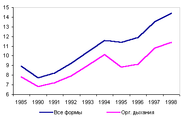 При относительно стабильном уровне общей заболеваемости и таких массовых болезней, как острые инфекции органов дыхания, наблюдается постоянный рост отдельных наиболее тяжелых нозологических форм. Так, постоянно растет число больных с онкологической патологией. За 4 года (с 1995 по 1998 гг.) заболеваемость раком среди детей увеличилась с 51,1 тыс. до 59,4 тыс. случаев. Число первичных заболевших с болезнями эндокринной системы, расстройствами питания, нарушениями обмена веществ и иммунитета за этот же период выросло с 306,5 до 372,9 тыс. случаев. Увеличивается заболеваемость болезнями крови и кроветворных органов, особенно анемиями, уровень которых за 4 года вырос на 29%. Заболеваемость бронхиальной астмой за 4 года увеличилась на 59,8% Особую тревогу внушает растущая среди детей заболеваемость туберкулезом и сифилисом. Заболеваемость детей туберкулезом (рис. 4.8) претерпела такую же эволюцию, что и заболеваемость взрослых и подростков. С 1991 г. начался рост числа заболевших, который достиг пика в 1994 г. Увеличивалась заболеваемость как всеми формами туберкулеза, так и туберкулезом легких. В 1995 г. наблюдалось некоторое снижение регистрации числа заболевших туберкулезом легких, но в 1996, 1997 и 1998 гг. рост заболеваемости возобновился, и в 1998 г. она была на 67,6% выше, чем в 1990.