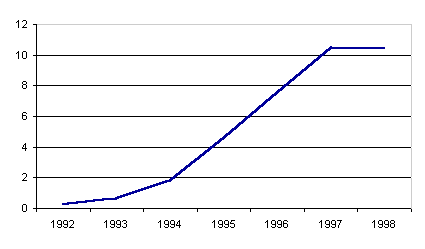 Рис. 4.9. Заболеваемость сифилисом на 100 тыс. детей до 15 лет. Россия, 1992-1998