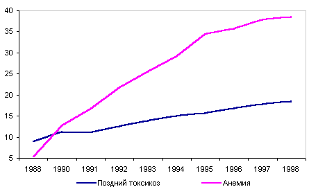 Рис. 4.10. Поздний токсикоз и анемия у женщин, закончивших беременность. Россия, 1985-1998, % В 1998 г. болезни мочеполовой системы отмечаются в 4,4 раза чаще, болезни системы кровообращения среди женщин, закончивших беременность, в 2,3 раза чаще по сравнении с 1985 годом.