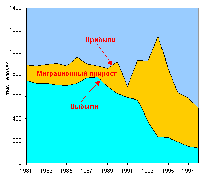 тенденции были похожими. Сильнее всего миграционные параметры изменились в обмене со Средней Азией: поток в Россию из стран этого региона в полтора раза возрос, а выезд из России в два раза сократился. Обмен стал резко асимметричным: если в 1980-1988 гг. на 100 прибывших приходилось 75 выбывших, то в последующие десять лет только 24. Соответственно миграционный прирост подскочил почти в 5 раз. В том же направлении эволюционировал обмен со странами Закавказья,