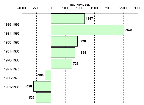 Рис. 6.6. Нетто-миграция между Россией и странами СНГ и Балтии. 1961-1998, тыс. человек.