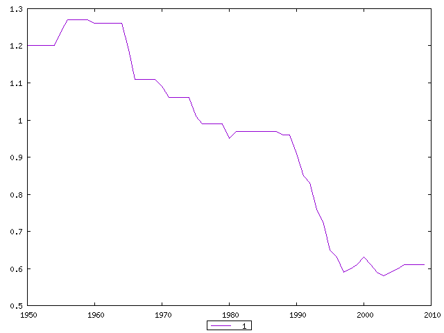 Нетто-коэффициент воспроизводства населения в 15 новых независимых государствах, 1950-2009